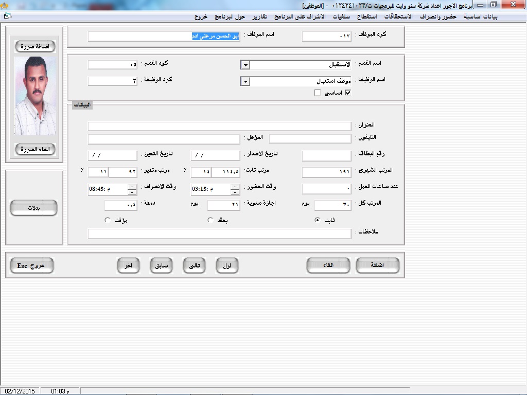 بطاقة عمل لكل موظف على حده تتضمن كافة بياناته (الاسم، السن، العنوان، صورة شخصيه، المؤهل، الحالة الاجتماعية، الوظيفة الحالية)